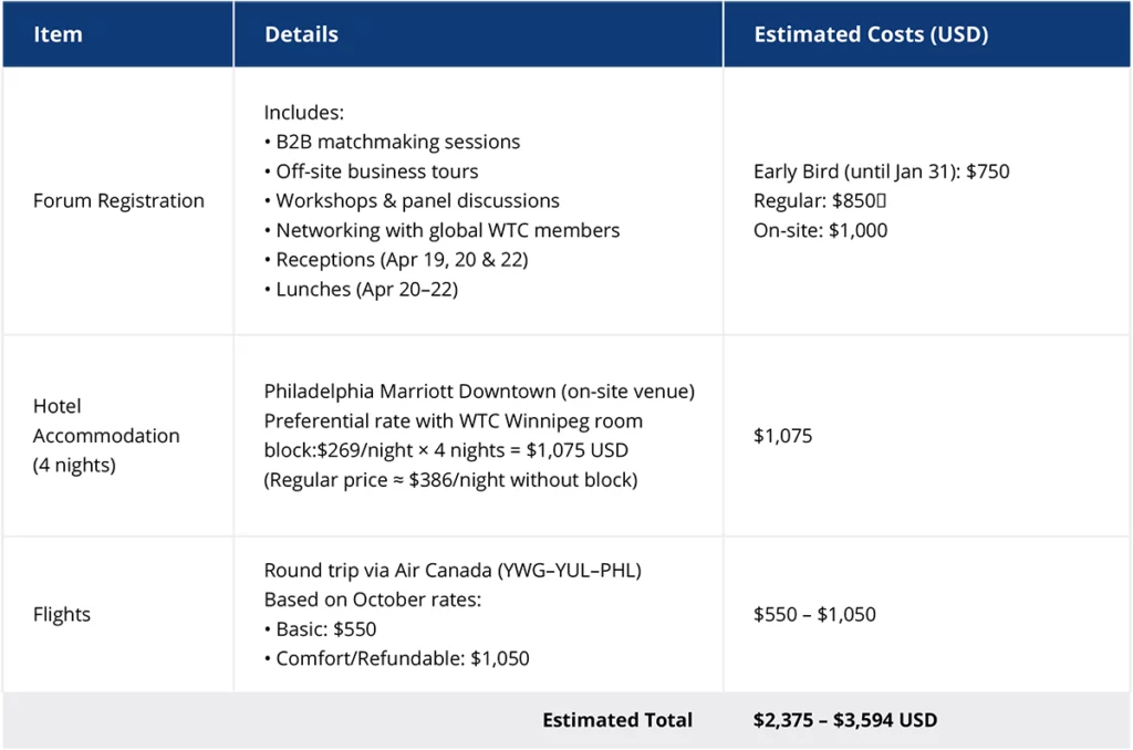 The following table outlines the estimated per-person costs for participants attending the forum as part of the Manitoba Delegation. All prices are listed in USD.
